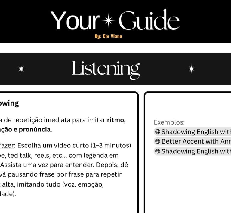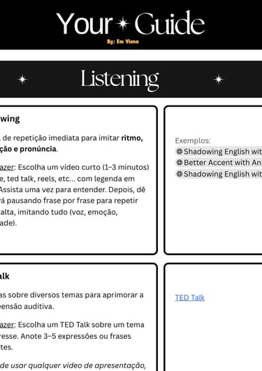 Um plano prático e estruturado com links clicáveis, sugestões de atividades e um passo a passo pra manter o inglês vivo no seu dia a dia. Você não vai mais depender de professor ou aula pra evoluir. Com esse guia, você se torna protagonista da sua rotina.